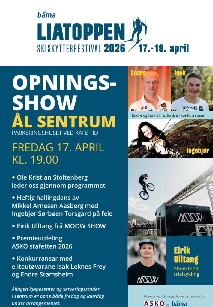 Fredag 17. april 2026 kl 19.00 blir det opningsshow i Ål sentrum.